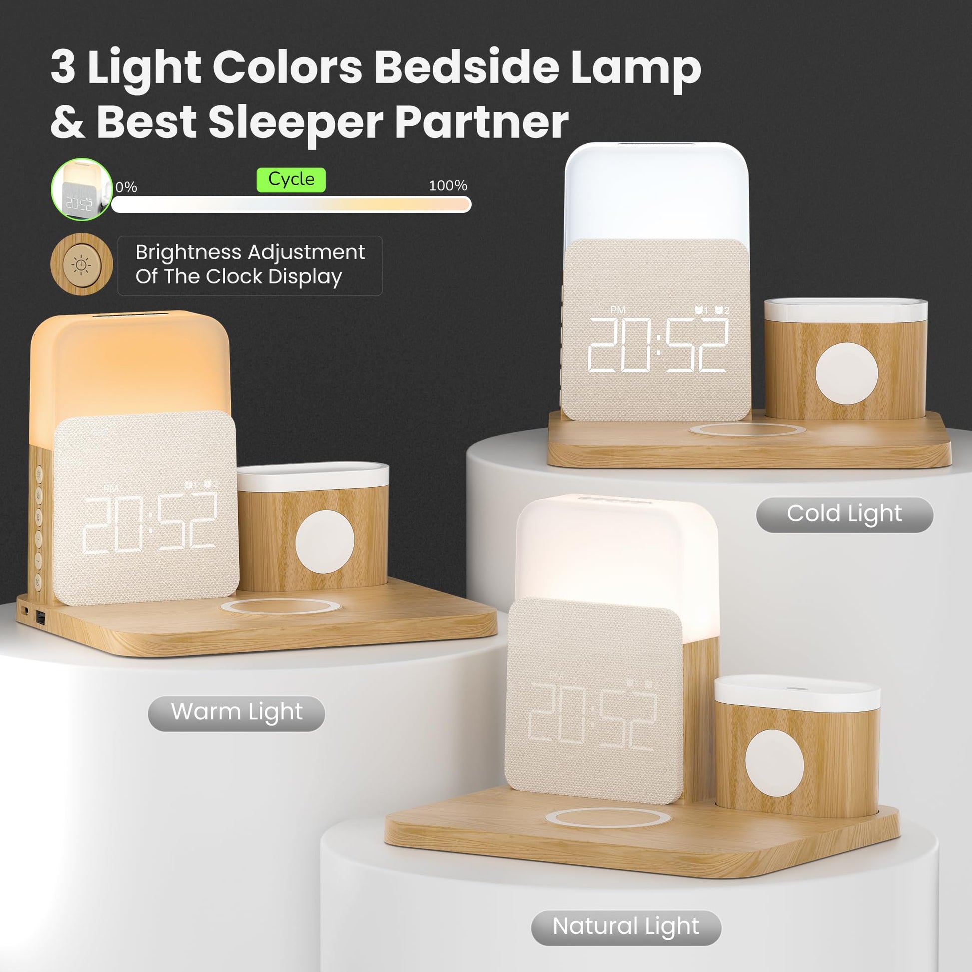 - All in One Wireless Charging Station:The wireless charging station has a wireless charger,digital alarm clock,and adjustable night light functions.The wireless charging station for multiple devices lets your desktop eliminate messy charging cables
