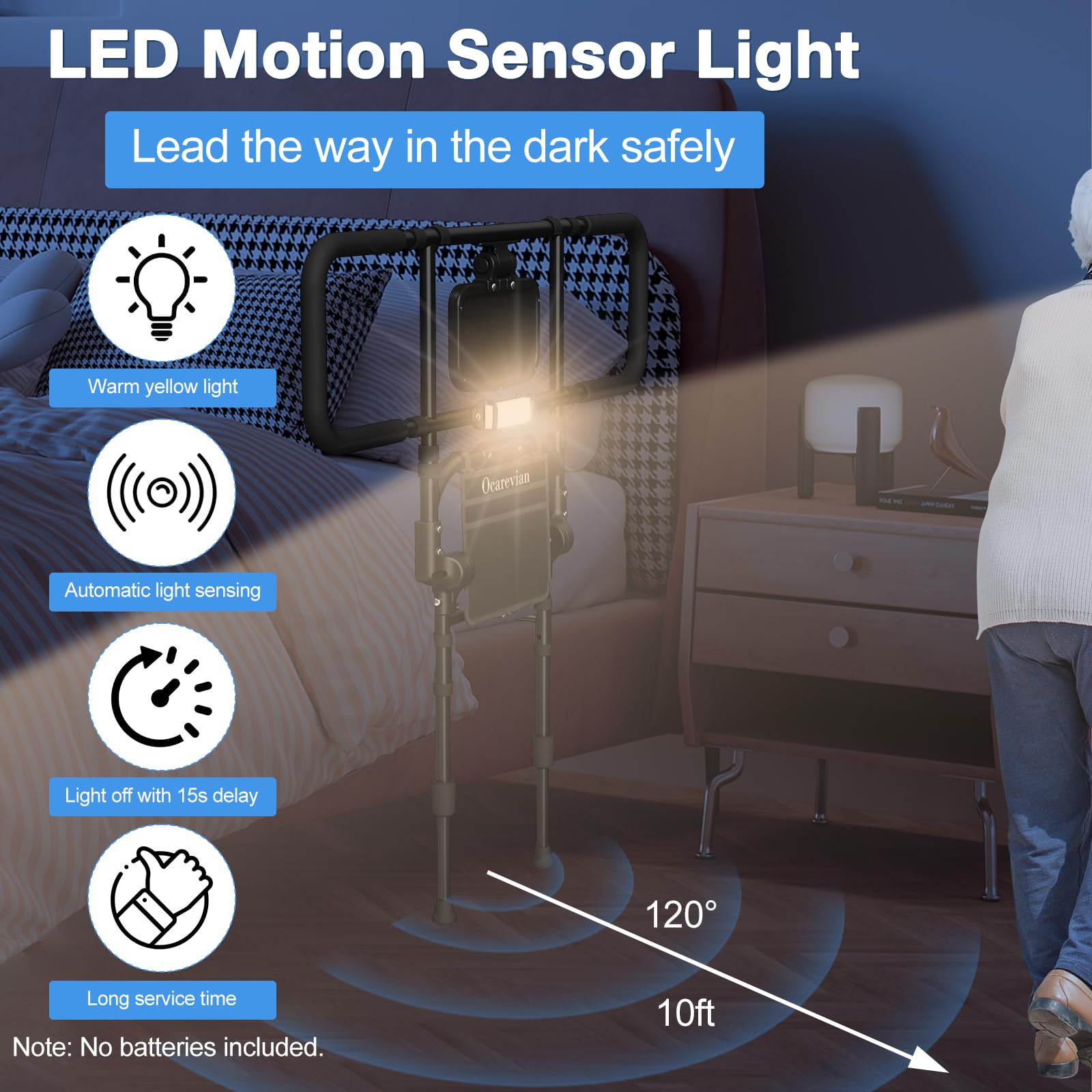 - Warm Light for the Night: Getting up at night is common for seniors. Instead of switching on harsh white lights, our bed rails added a sensor light to provide a warm yellow glow. when you leave the bed, it will automatically turn on —gentle on your eyes and great for nighttime guidance