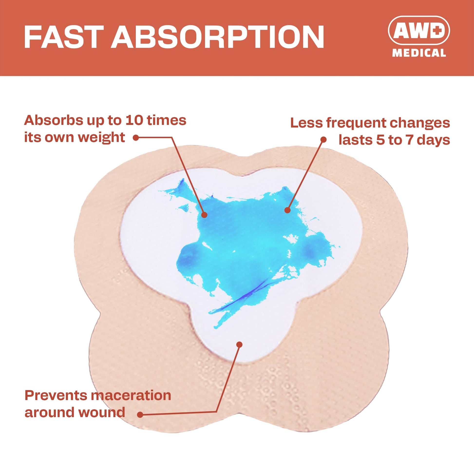 - Reduces Frequency of Dressing Changes: Superabsorbent core ensures fast absorption and retention of exudate, even under compression.