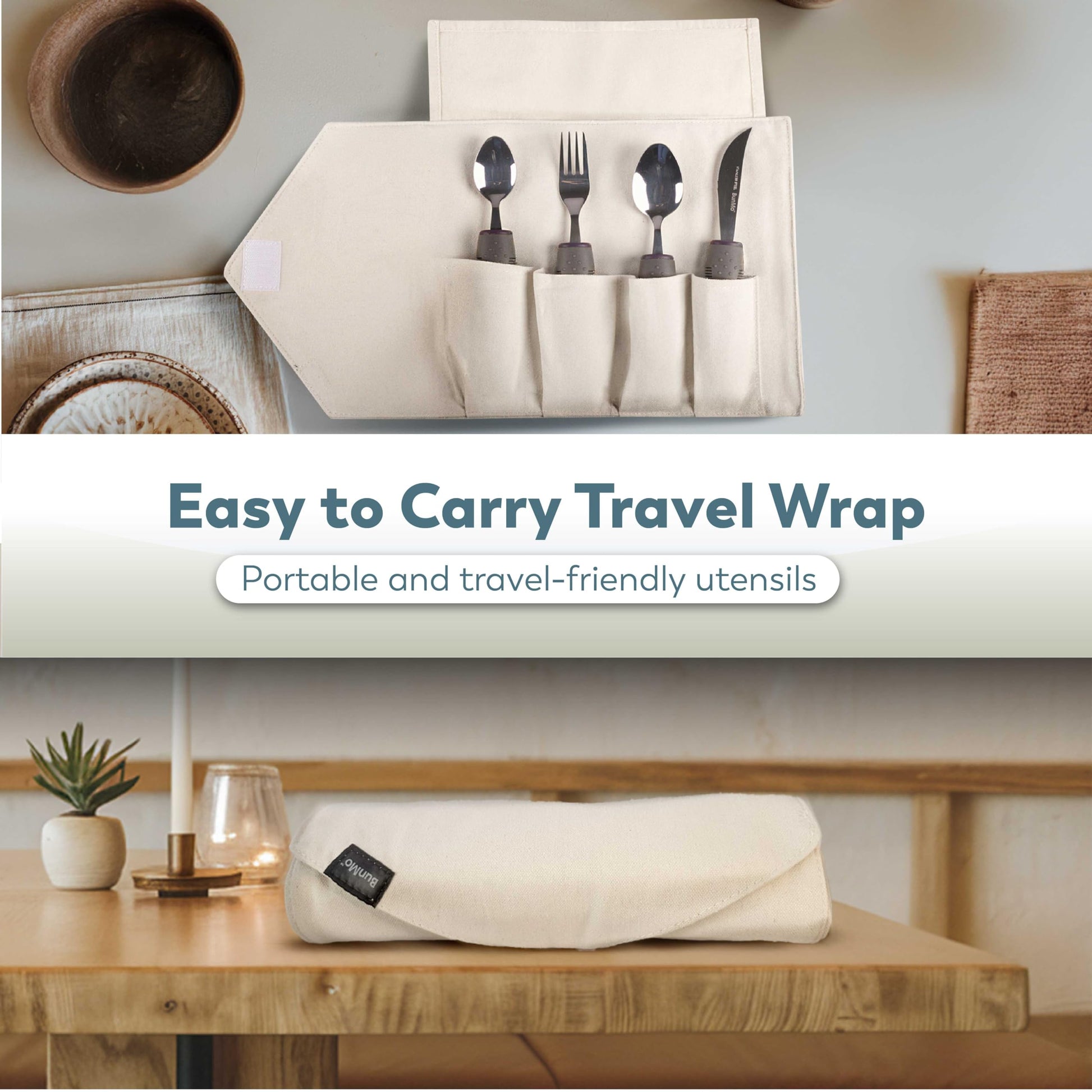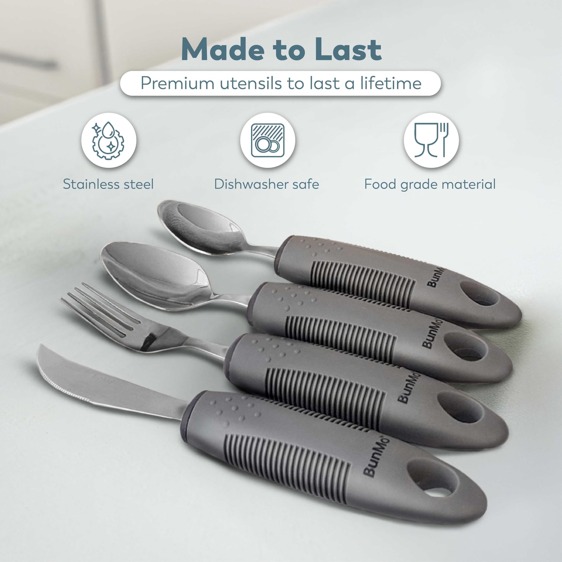 BUNMO Utensils for Elderly, Arthritis, Weak Hand Grip, Tremors & Handicapped - Convenient Travel Pouch - 2.6oz Lightweight - Stainless Steel - Eat Independently - Adaptive Gray 4 Piece Set