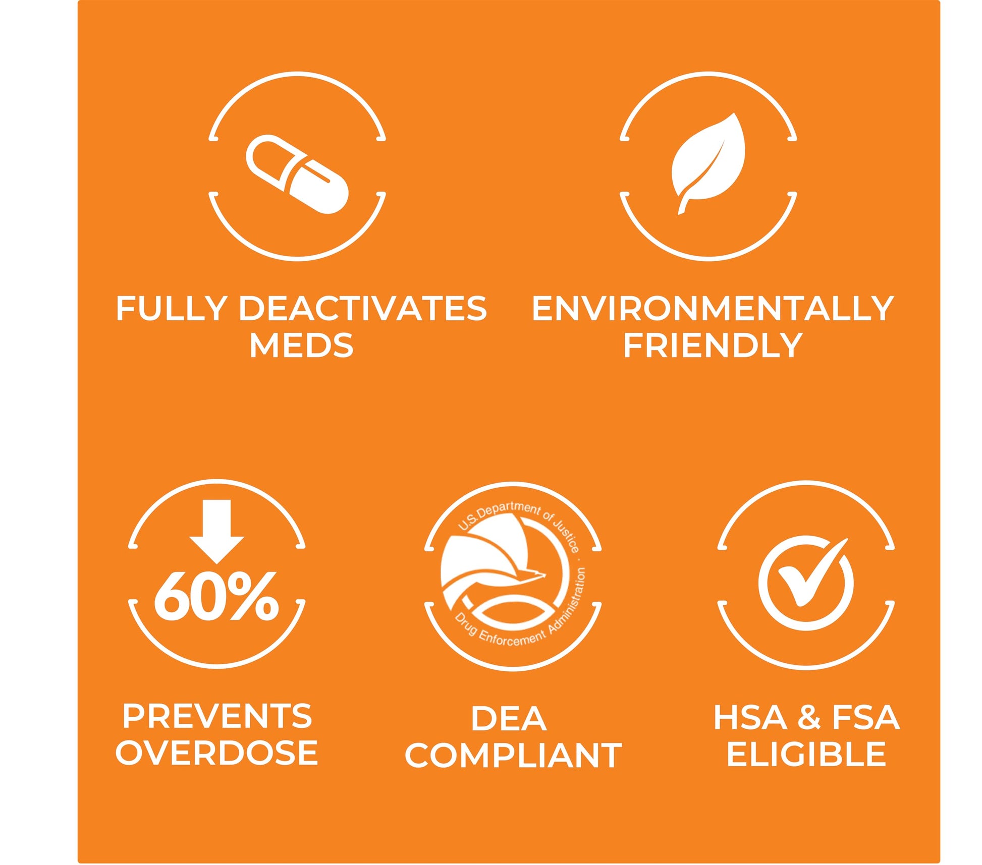 - Safe To Use: Our drug deactivation container uses non-toxic ingredients that fully deactivate drugs preventing harmful chemicals from reaching children, pets, or other friends and family.
