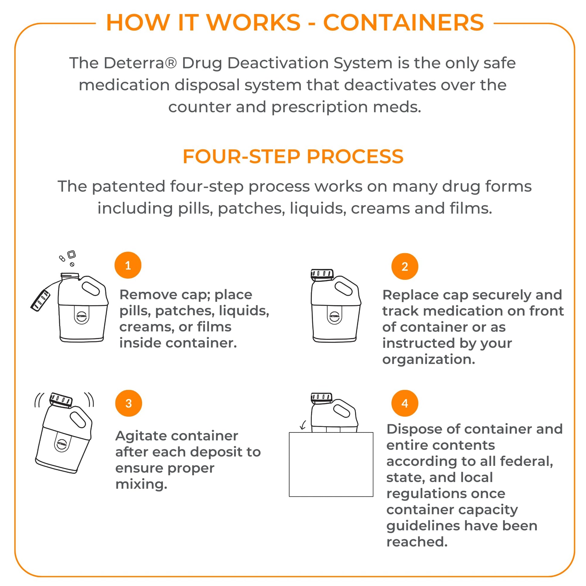 - Effective: The ONLY drug deactivation container scientifically proven to work. The drug deactivation container provides a safe, convenient and permanent disposal of unused, expired or unwanted medications at home or in a clinical setting. Each container will deactivate and dispose of up to 2,500 pills, 84oz/2.5L or 250 patches at a time.
