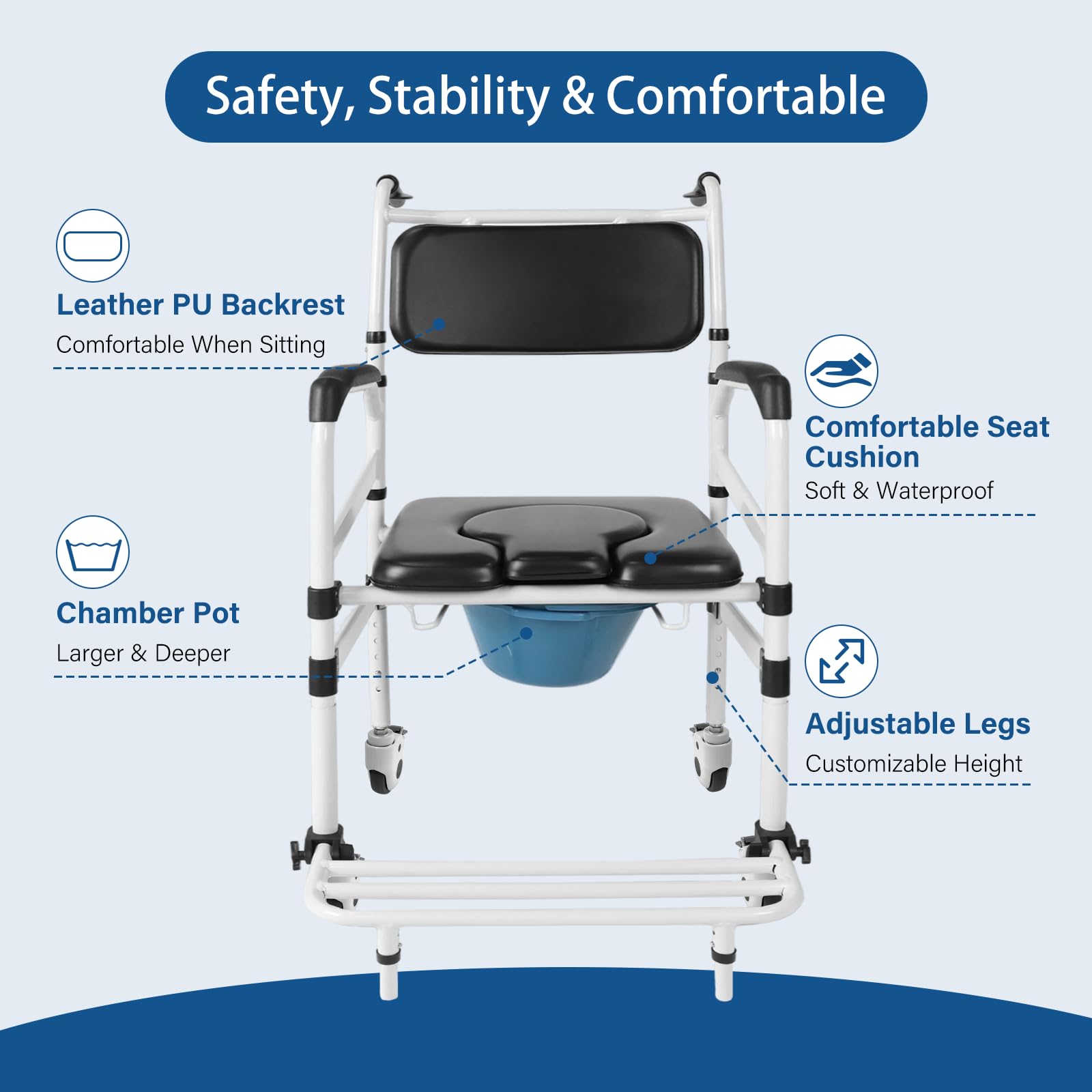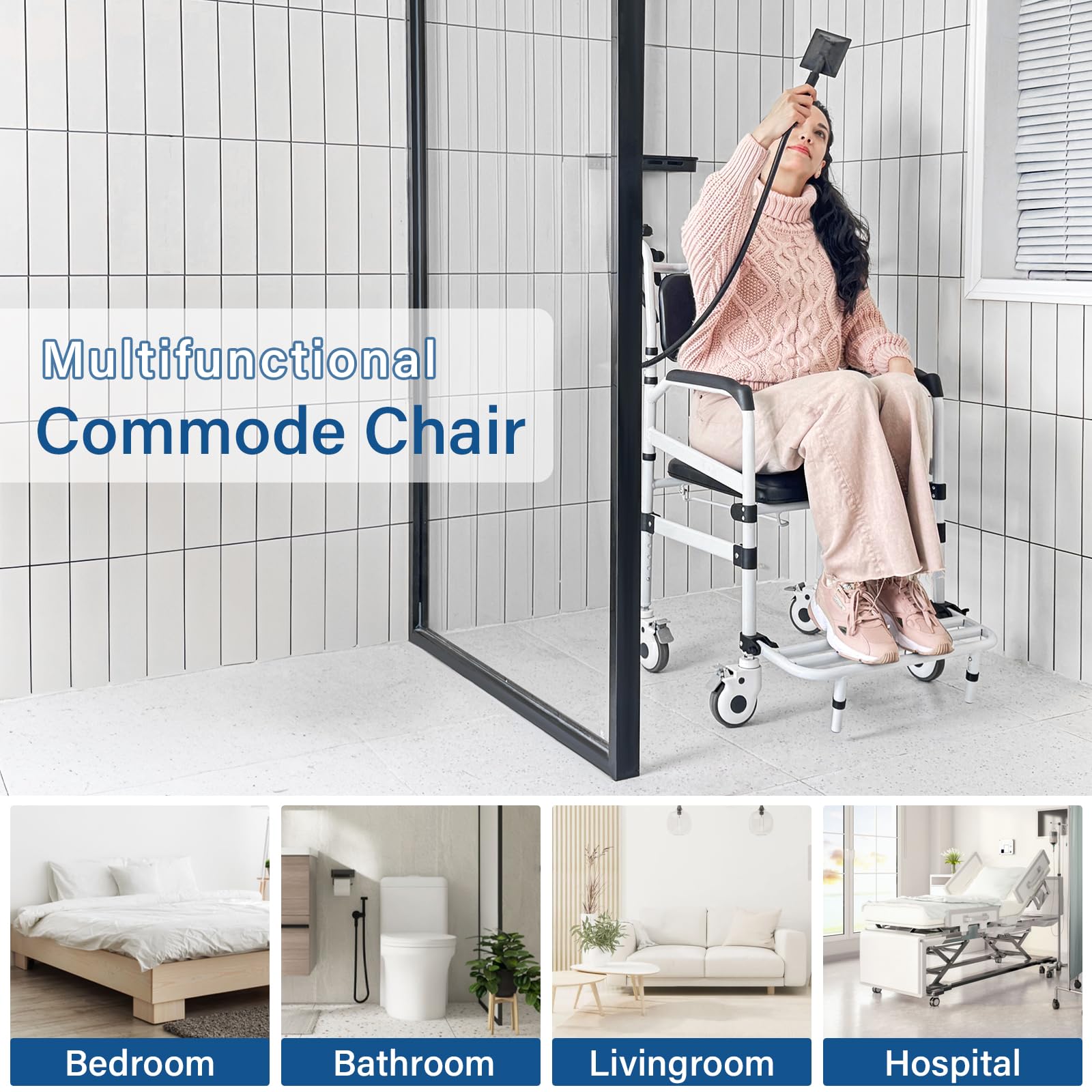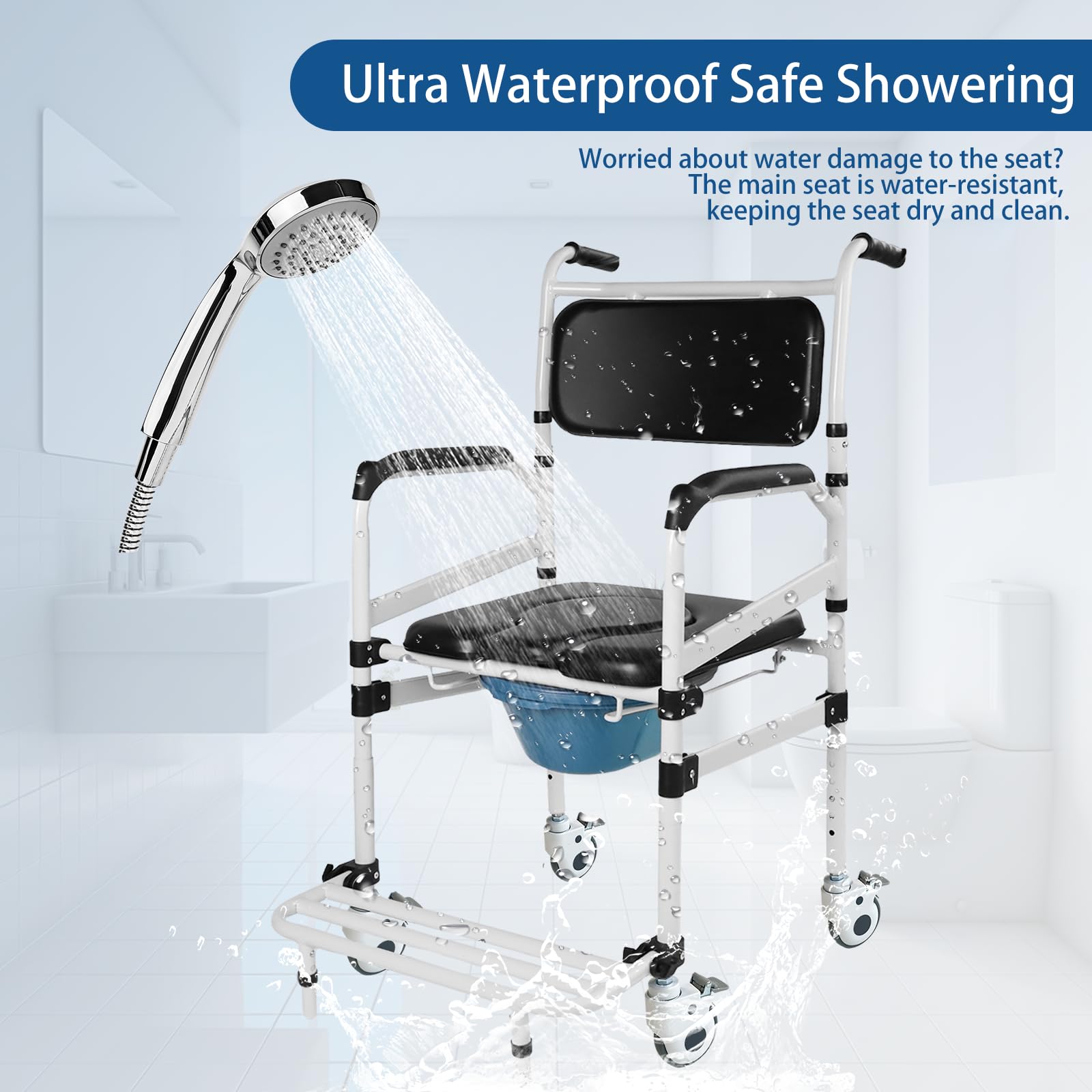 Eosprim Rolling Shower Chair with Handles Arms, Bedside Commode Chair with Wheel, Wheelchair for Elderly Disable,Heavy Duty Raised Toilet Seat Riser for Adults