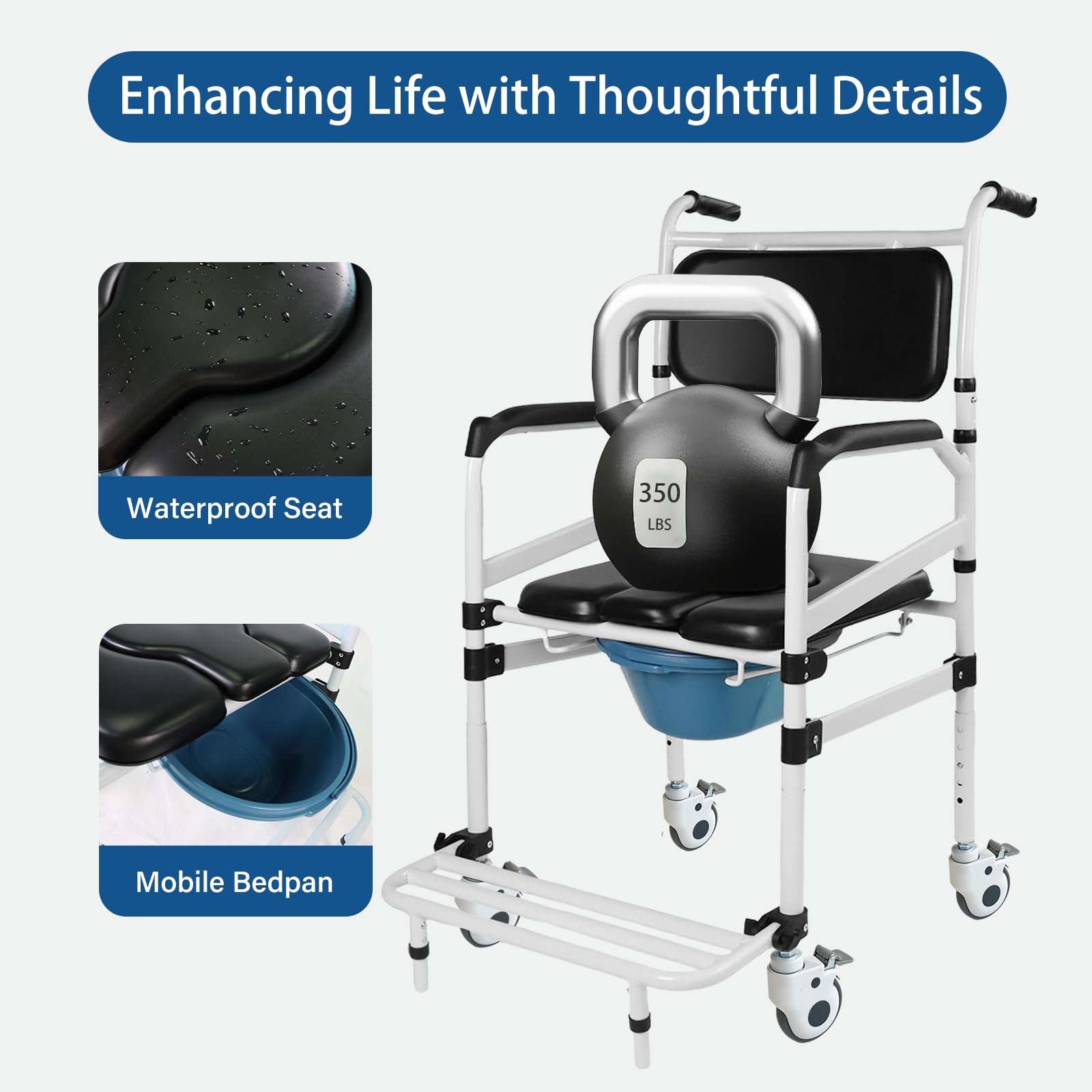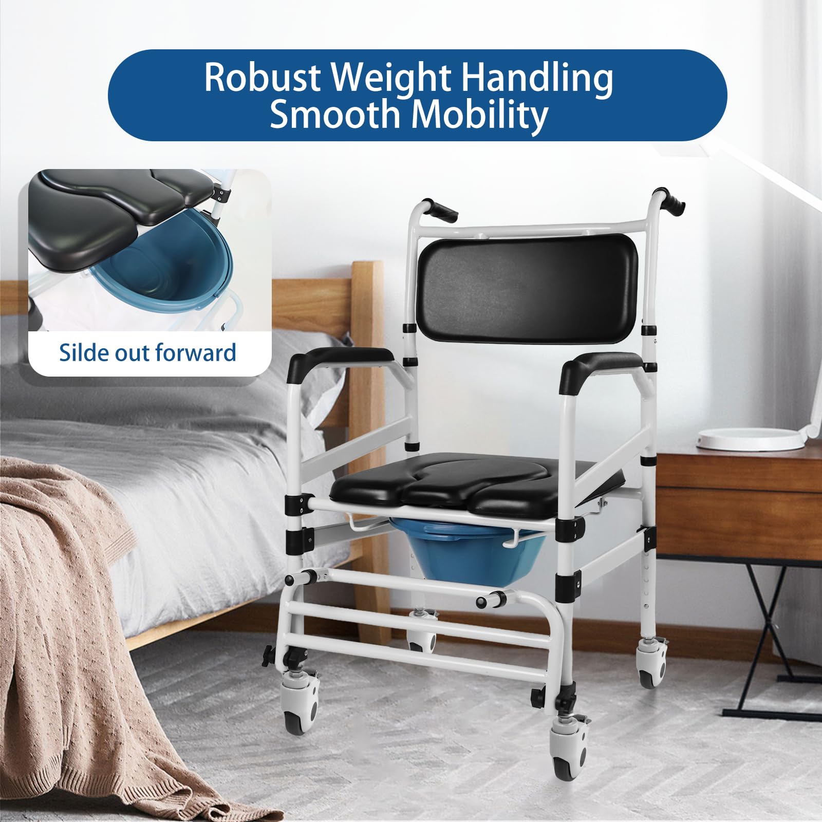Rolling Shower Chair with Handles Arms, Bedside Commode Chair with Wheels