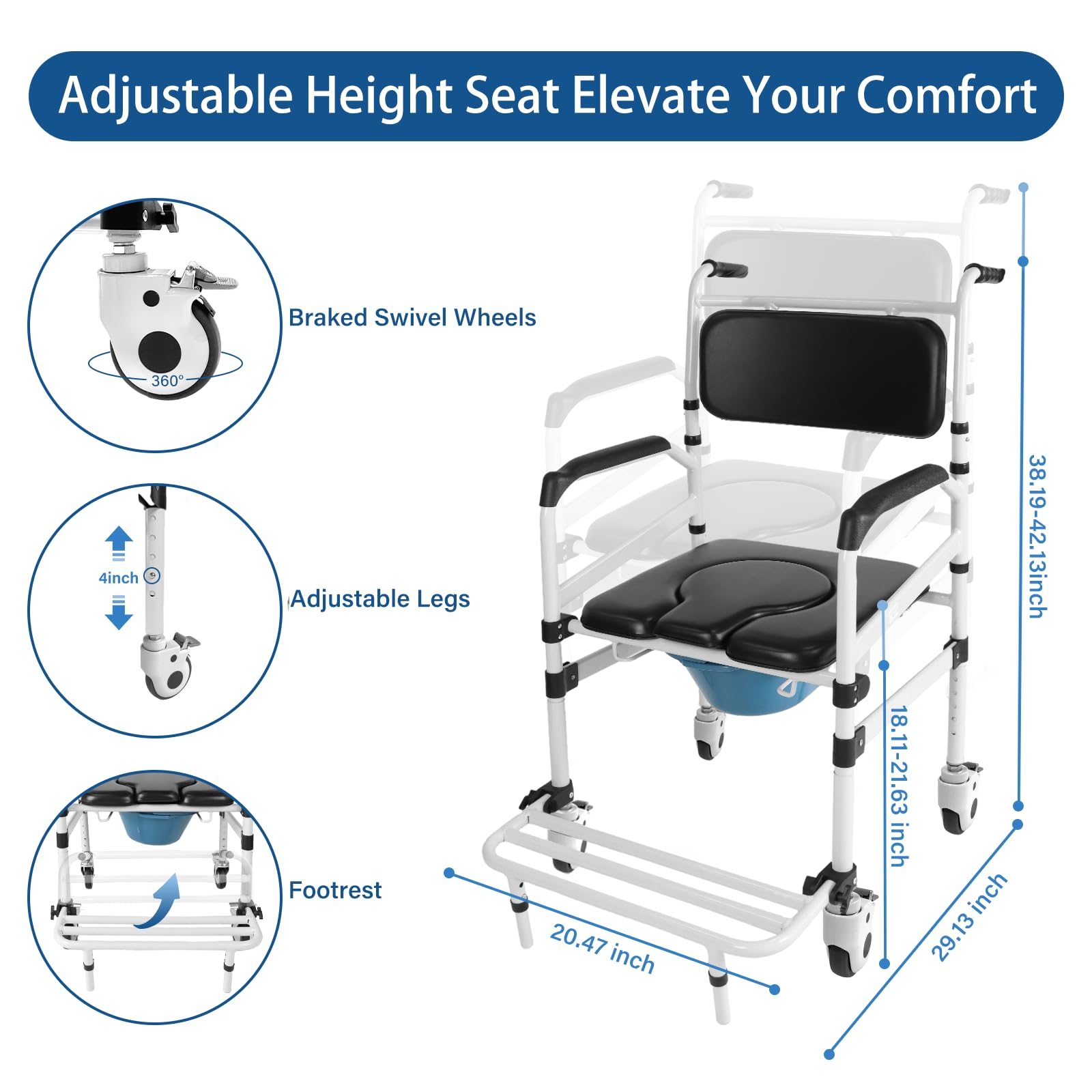 - 【360° Ultra-Quiet Wheels】 Equipped with four 360° ultra-quiet wheels, this bathroom wheelchair glides smoothly and almost silently, ensuring a comfortable and peaceful experience for users. The robust brake system provides additional safety, offering users extra peace of mind.