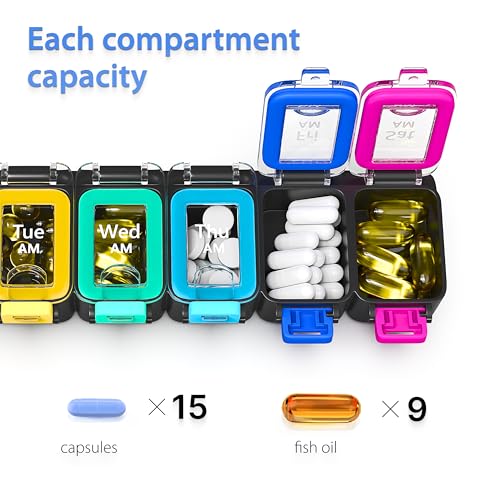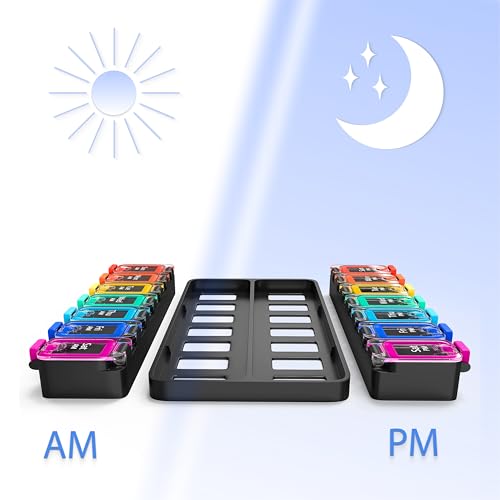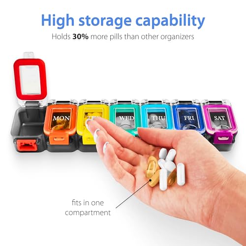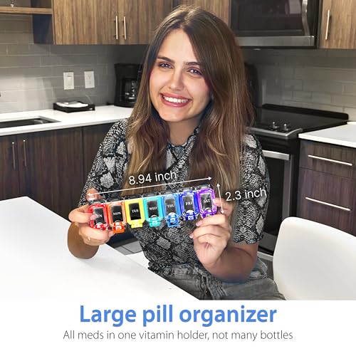 - Color-Coded: The pill box 7 day features brightly colored lids with a rainbow design, facilitating easy pill management. Large, clear day labels on the lids help with quick identification