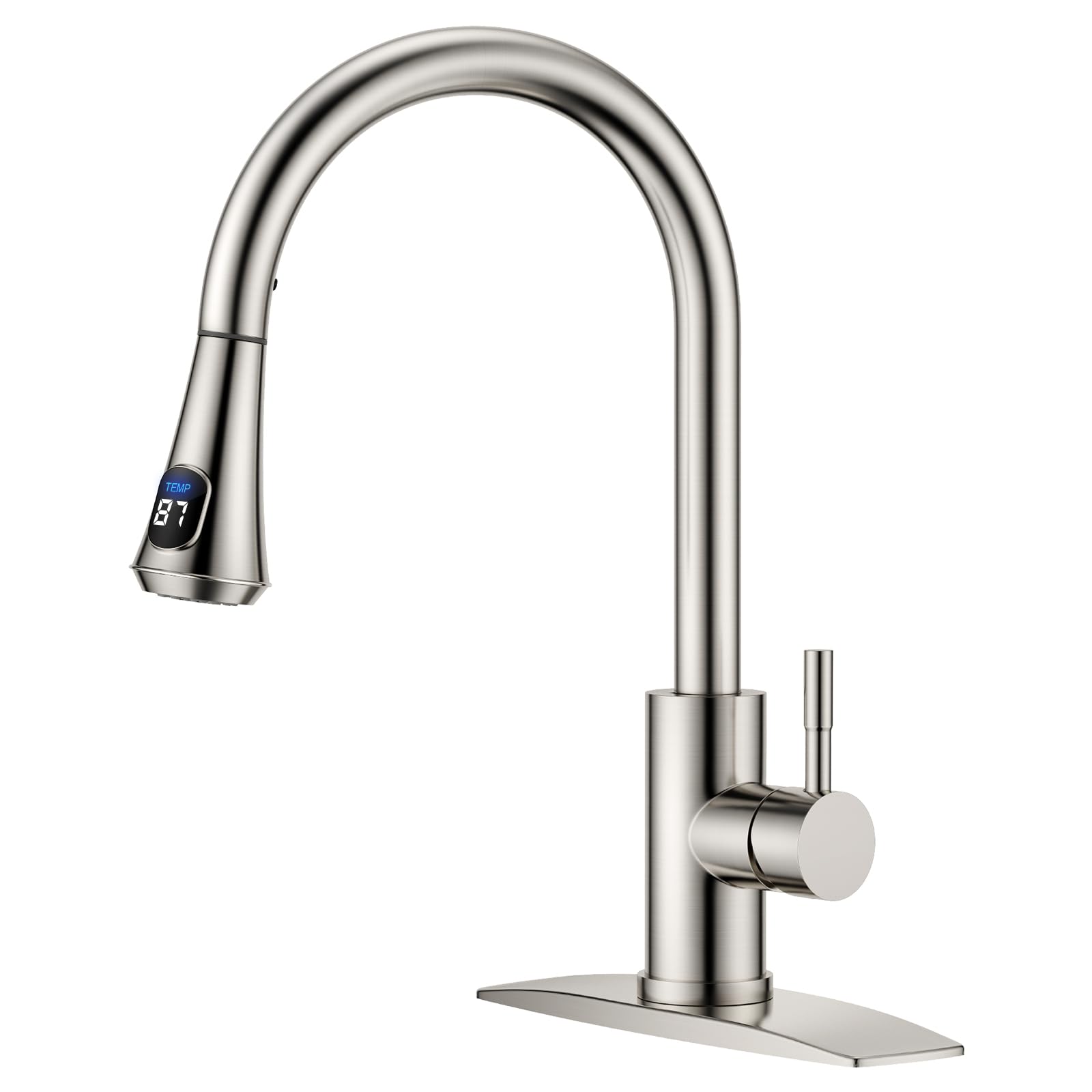 FORIOUS LED Kitchen Faucet with Pull Down Sprayer, Brushed Nickel, Single Handle Modern Stainless Steel Sink Faucet with Temperature Digital Display, Suitable for Farmhouse Camper Rv Bar