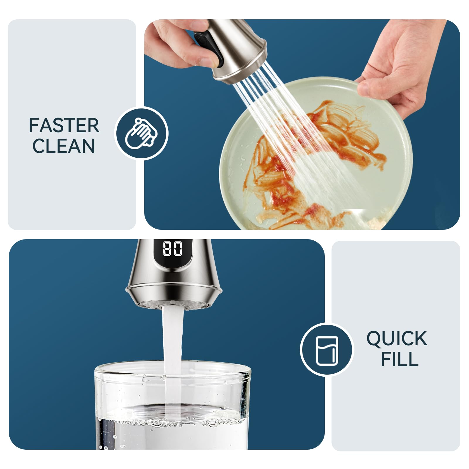 - LED Temperature Display: This LED kitchen faucet features a smart LED screen that shows water temperature in real-time—blue for cold, green for warm, and red for hot. Easily monitor the temperature to avoid scalds and ensure a safe, comfortable experience