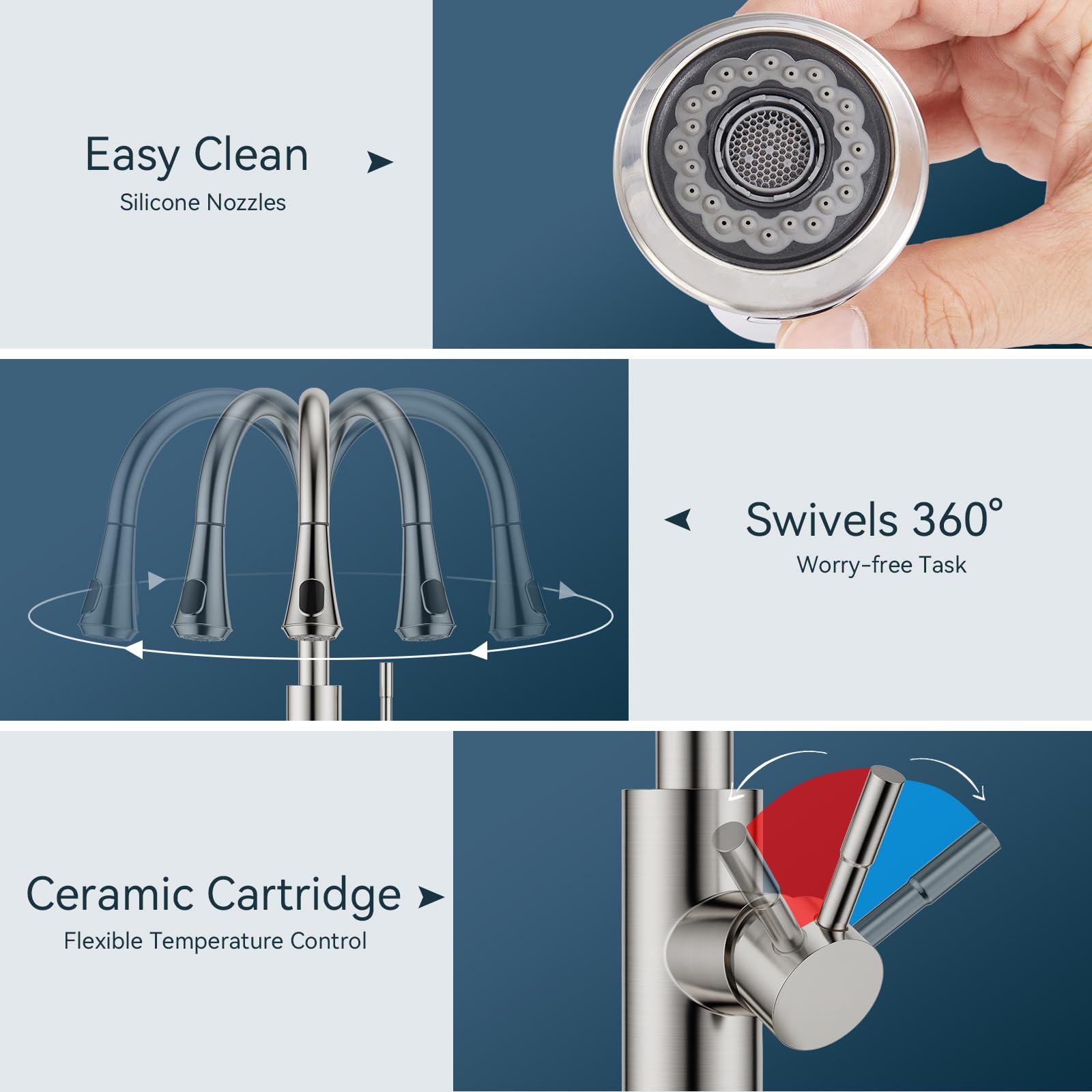 - Superior Quality: Made from lead-free SUS 304 stainless steel, this kitchen faucets features drip-free ceramic cartridges and high-temp PEX hoses that prevent leaks, ensuring durability and safety. Flow Rate: 1.8 Gallons Per Minute, saving 20% water
