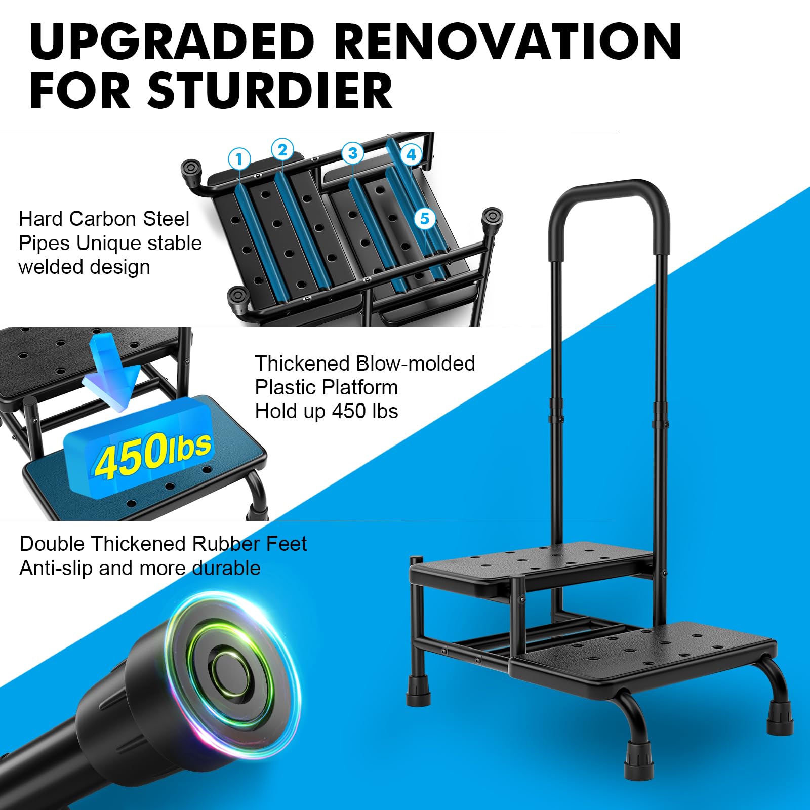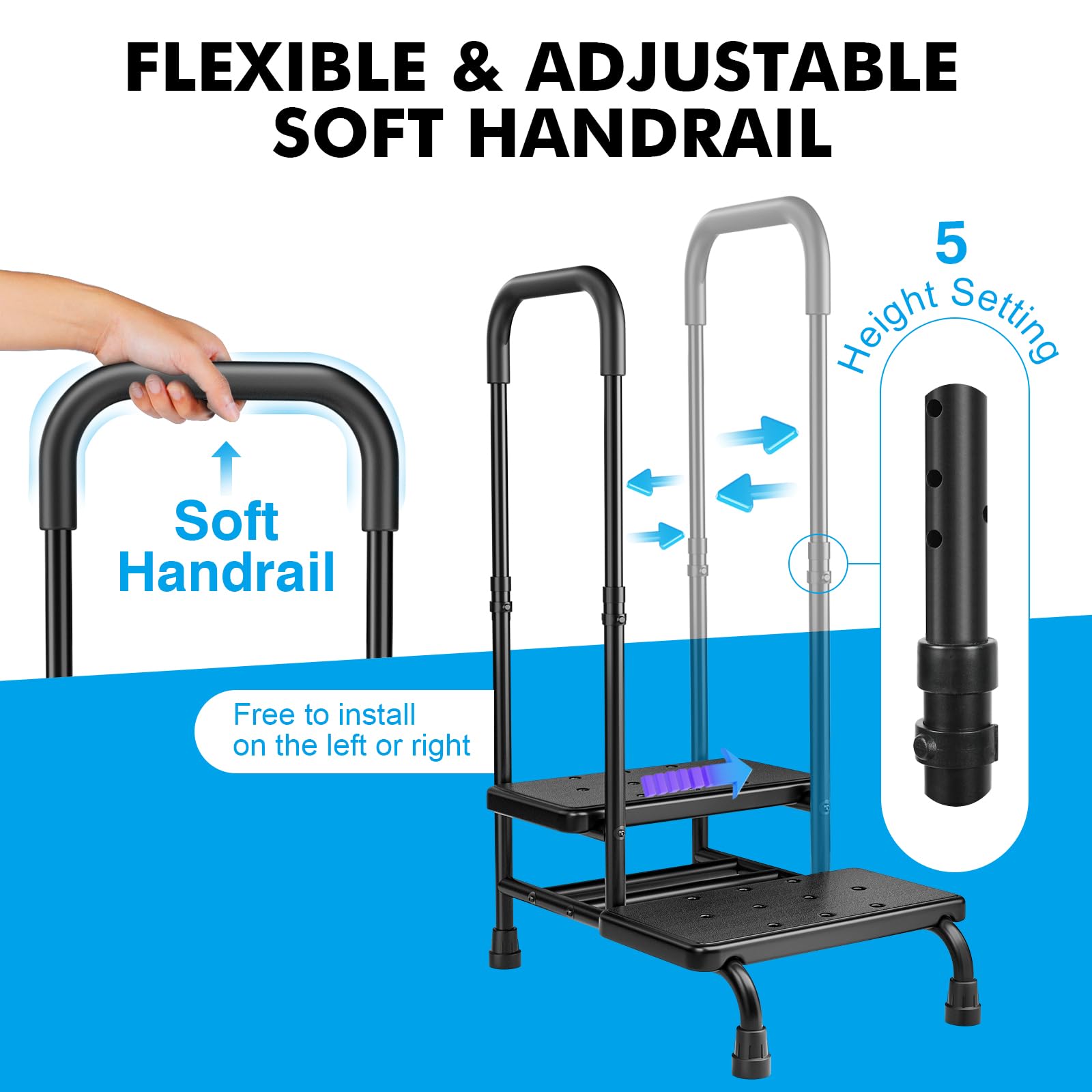 - 【Flexible & Adjustable Soft Handrail】: FORTEMOTUS heavy-duty step stool with handle for the elderly offers 5 adjustable heights from 35.4'' to 39.2'' and allows the handle to be freely installed on either side. These flexible customization features cater to different users' height, handedness, and surroundings for enhanced users' comfort and freedom