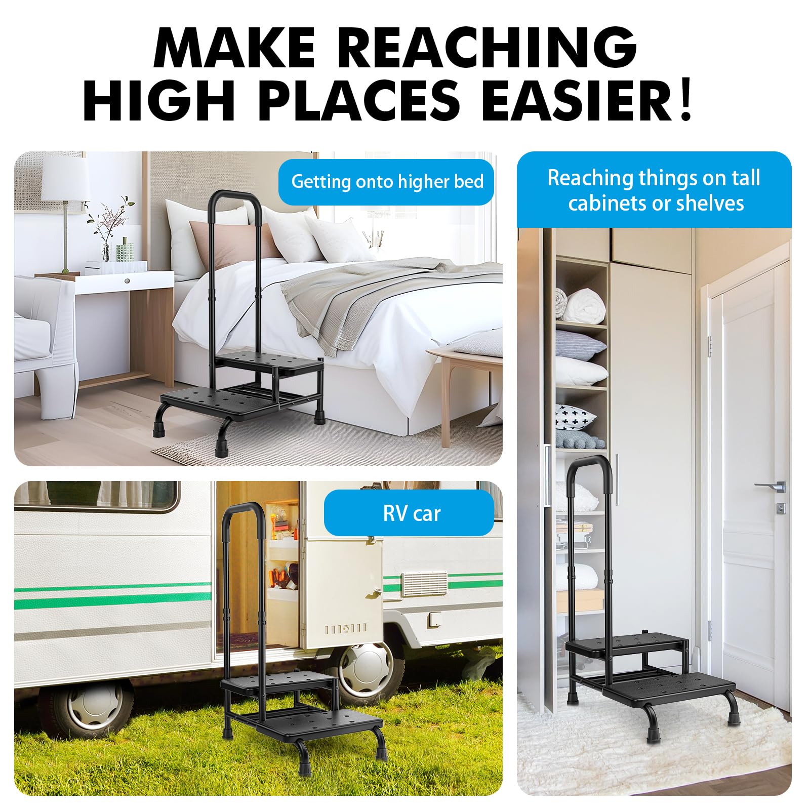 - 【Easy to Step upon& Knee Friendly】: The two-step design with a handrail is beneficial for individuals with knee issues or assisting patients in hospitals to access taller beds, vehicles, and bathtubs, or in and out of the room easily. It also could serve as a convenient step stool at home for seniors and adults to get in or out of higher beds, or reach items in elevated areas
