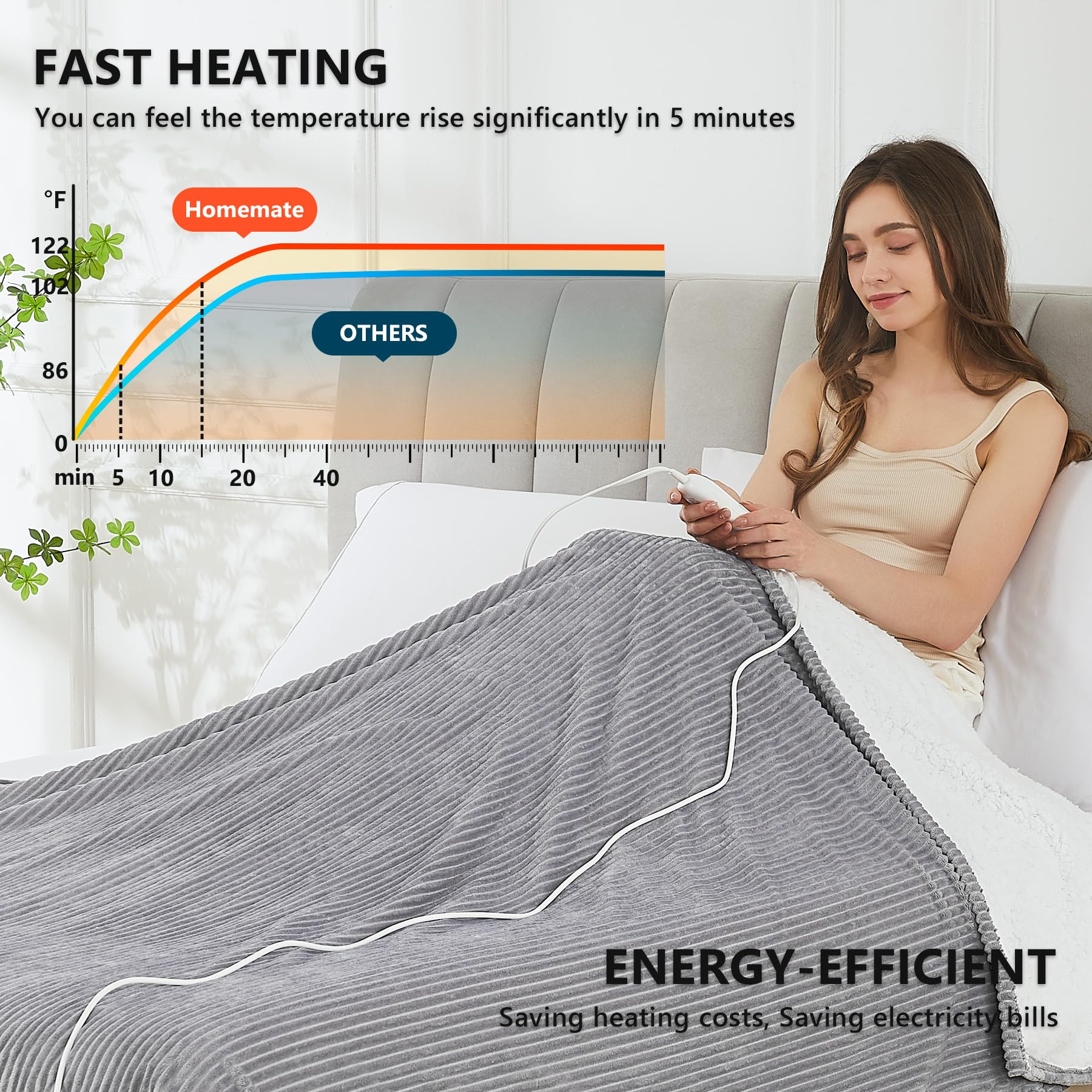 - 【ENERGY SAVING】: Homemate heated blanket use the intelligent temperature adjustment technology.When the temperature rises,the heated blanket will automatically adjust the temperature according to the surrounding environment,which can always provide users with a comfortable feeling and is conducive to energy saving.Compared with air conditioner,using Homemate heated blanket is more energy efficient,and you can save more heating costs in winter.