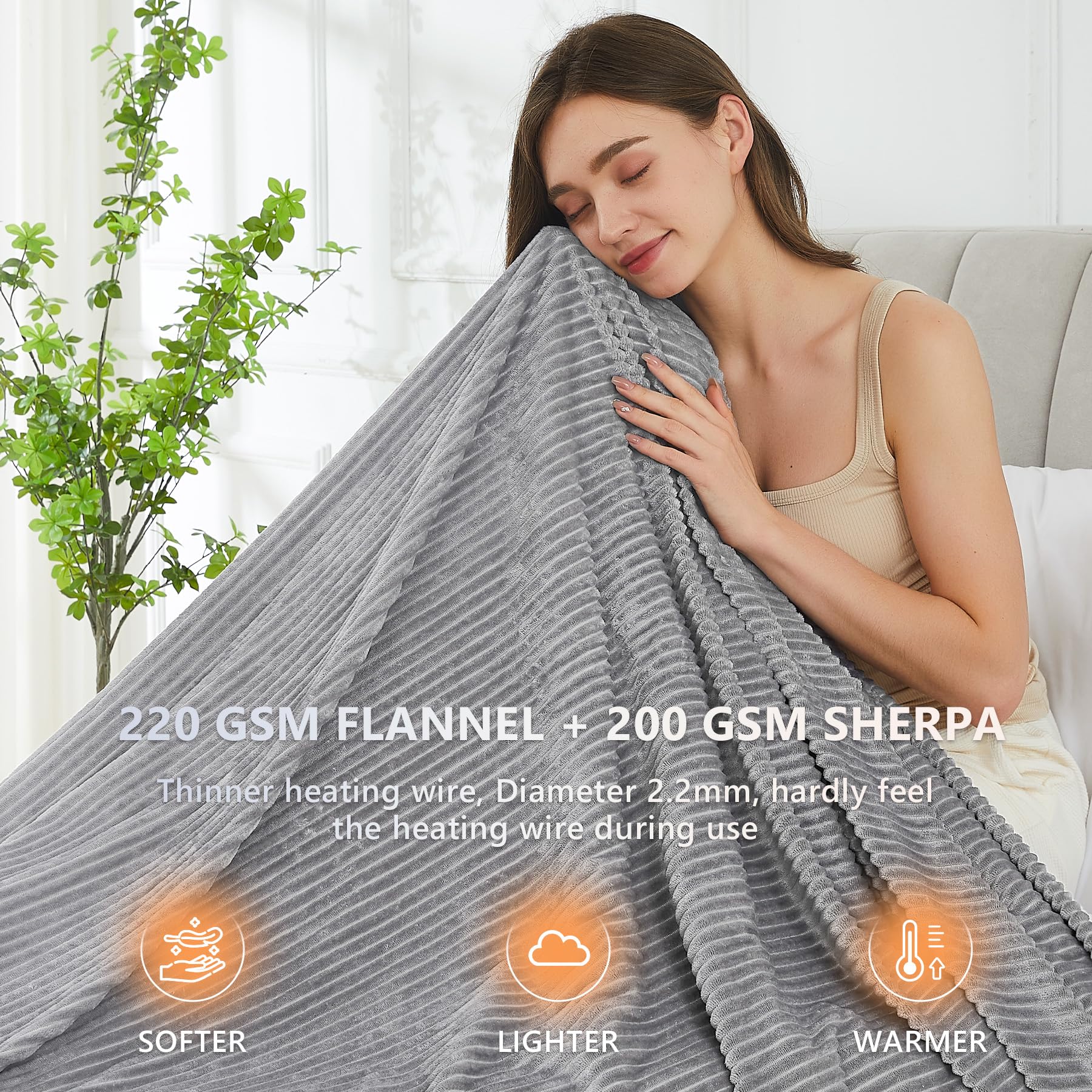 - 【PREMIUM MATERIAL】: 220gsm flannel + 200gsm sherpa.The fabric is very soft,thicker than normal blankets,and warmer than normal blankets even without electricity.The fabric is durable and does not shed.The diameter of the heating wire is 2.2 mm,and the existence of the heating wire is hardly felt during use,which is more comfortable.