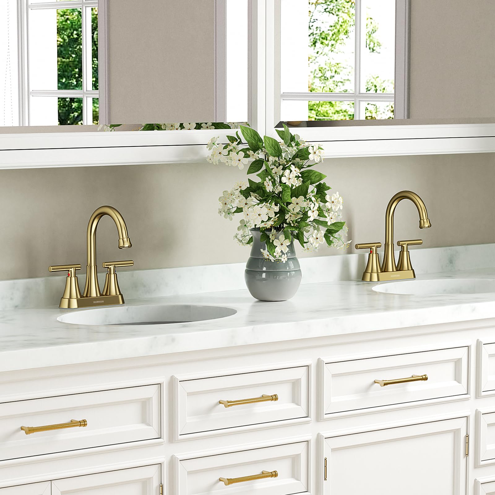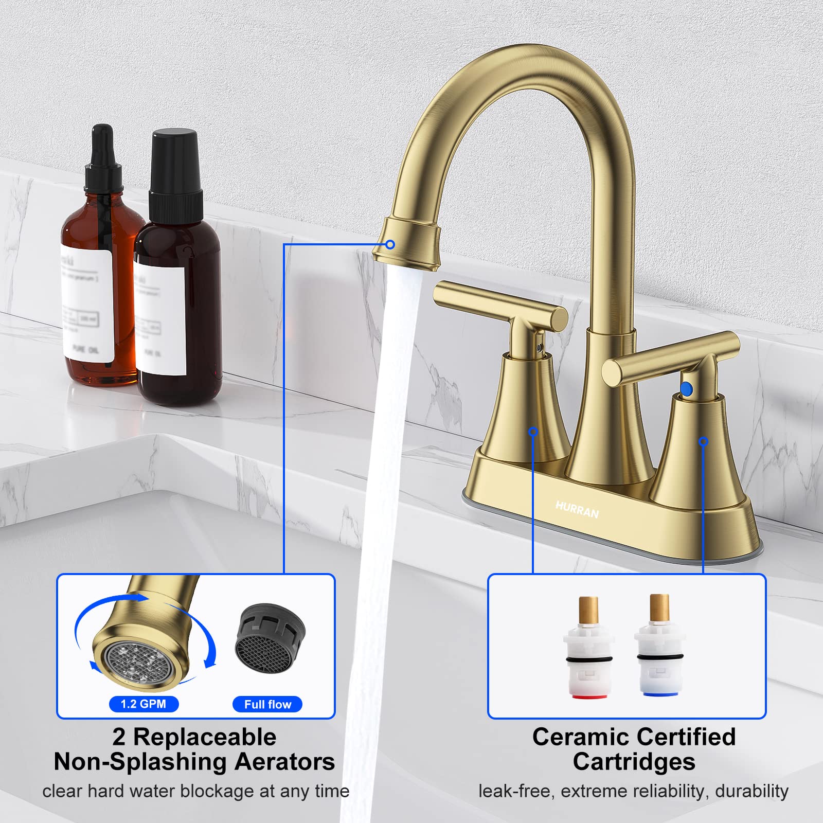 Hurran 4 inch Brushed Gold Bathroom Sink Faucet with Pop-up Drain and 2 Supply Hoses, Stainless Steel Lead-Free 2-Handle Centerset Faucet for Bathroom Sink Vanity RV