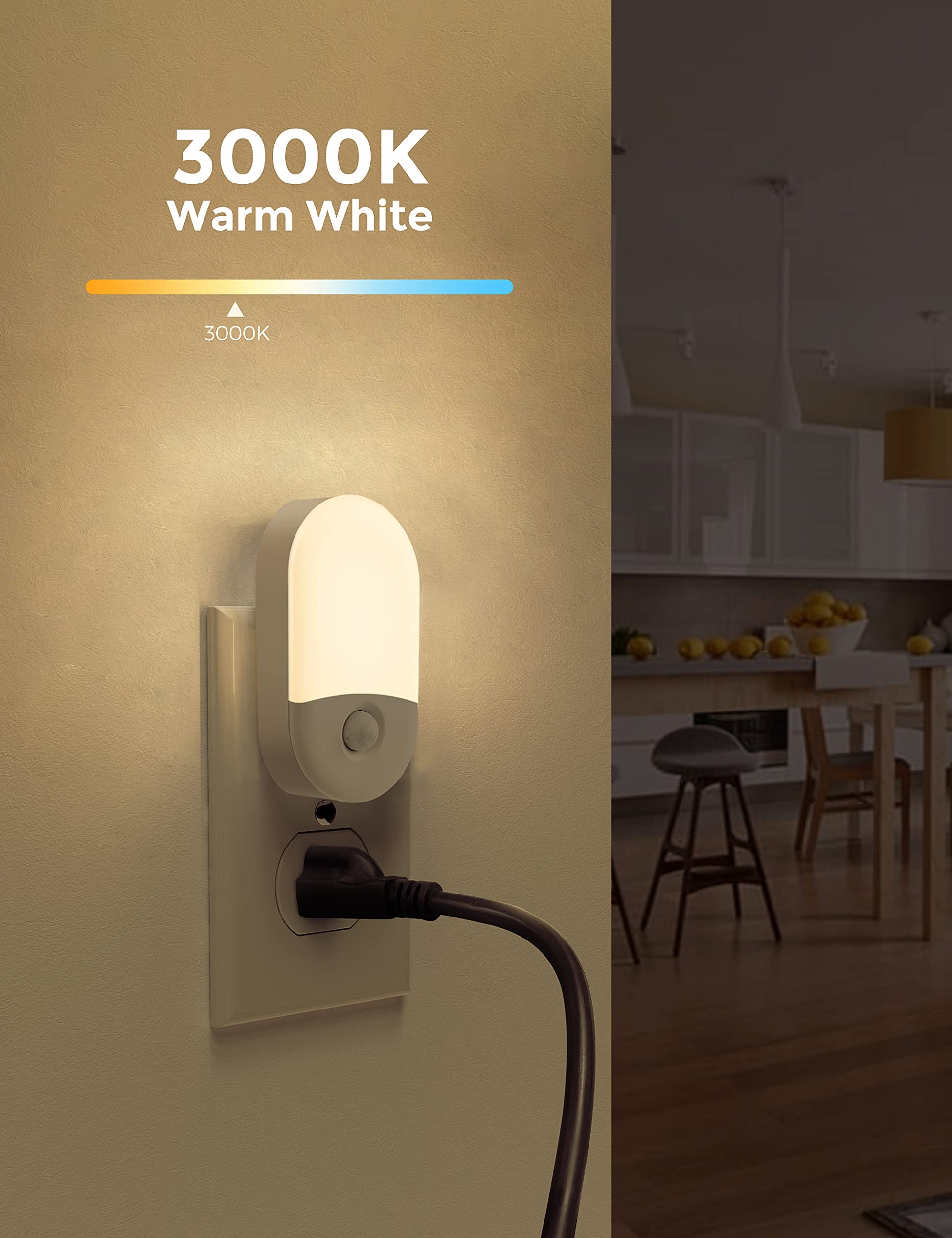 - COMFORTABLE LIGHTING: This plug in motion sensor night light provide 3000K soft white lighting and you can move around your house without turning on the main lights at night. Glare-free and not dazzling.