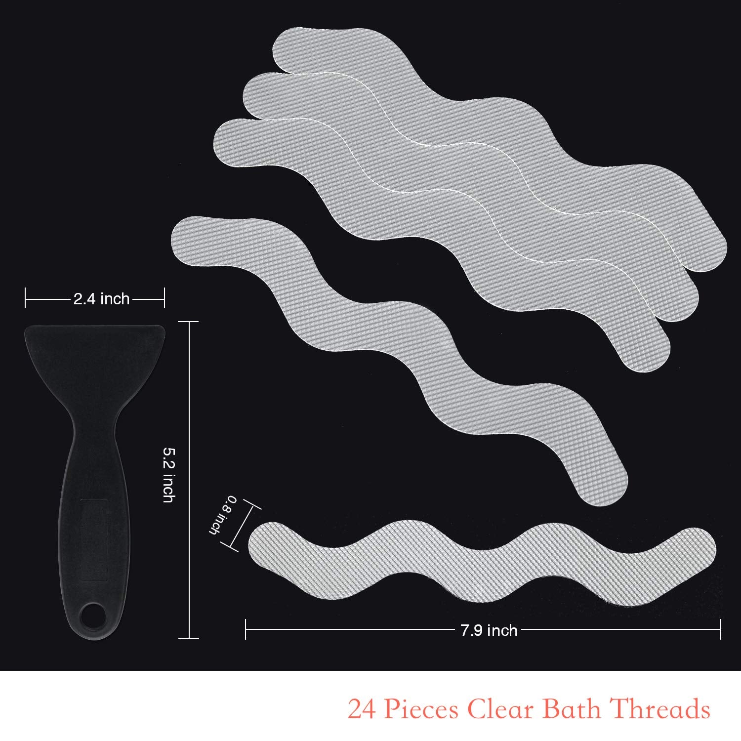 - The package comprises 24 pieces (0.8”x7.9”) of clear stickers alongside 1 high-quality silicone scraper. Ideally, the 24 stickers can occupy most of the surface of bathtub thereby reducing the risk of accidental slips. On top of that, you can even use these stickers on the stairs to make them much more secure.