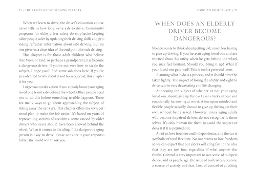 Details: Are your aging parents resisting your attempts to help them? Are you concerned your aging loved ones will run out of money and you will have to shoulder the financial burden? Are you worried that the care of your aging parents will cause conflict with your siblings? Are you afraid your aging parents will make unwise financial decisions or be taken advantage of as their mental state declines? Are you worried your aging parents will hurt themselves or others, but don't know how to start the difficult conversation? Do you understand your legal rights and responsibilities in regard to your aging parents? Free yourself from these stresses, gain confidence, and move ahead calmly with the valuable information at your fingertips in The Family Guide to Aging Parents.Imagine: Being able to find just the right words to approach your aging parents about finances Knowing how to best protect your aging loved ones from financial predators Knowing how talk to your aging loved ones about giving up driving when the time comes Being able to plan ahead for an aging parent who is running out of money and taking advantage of all benefits available to them Understanding how to get past your aging parents' resistance and successfully give them the assistance they need Being able to competently choose a home care worker, assisted living, or nursing home With expert advice from Carolyn Rosenblatt, RN and elder law attorney, with direct experience helping hundreds of families like yours, this crucial guidebook, The Family Guide to Aging Parents offers you all you need to competently handle what lies ahead, in the legal, financial, and heath care issues that come with caring for aging parents.