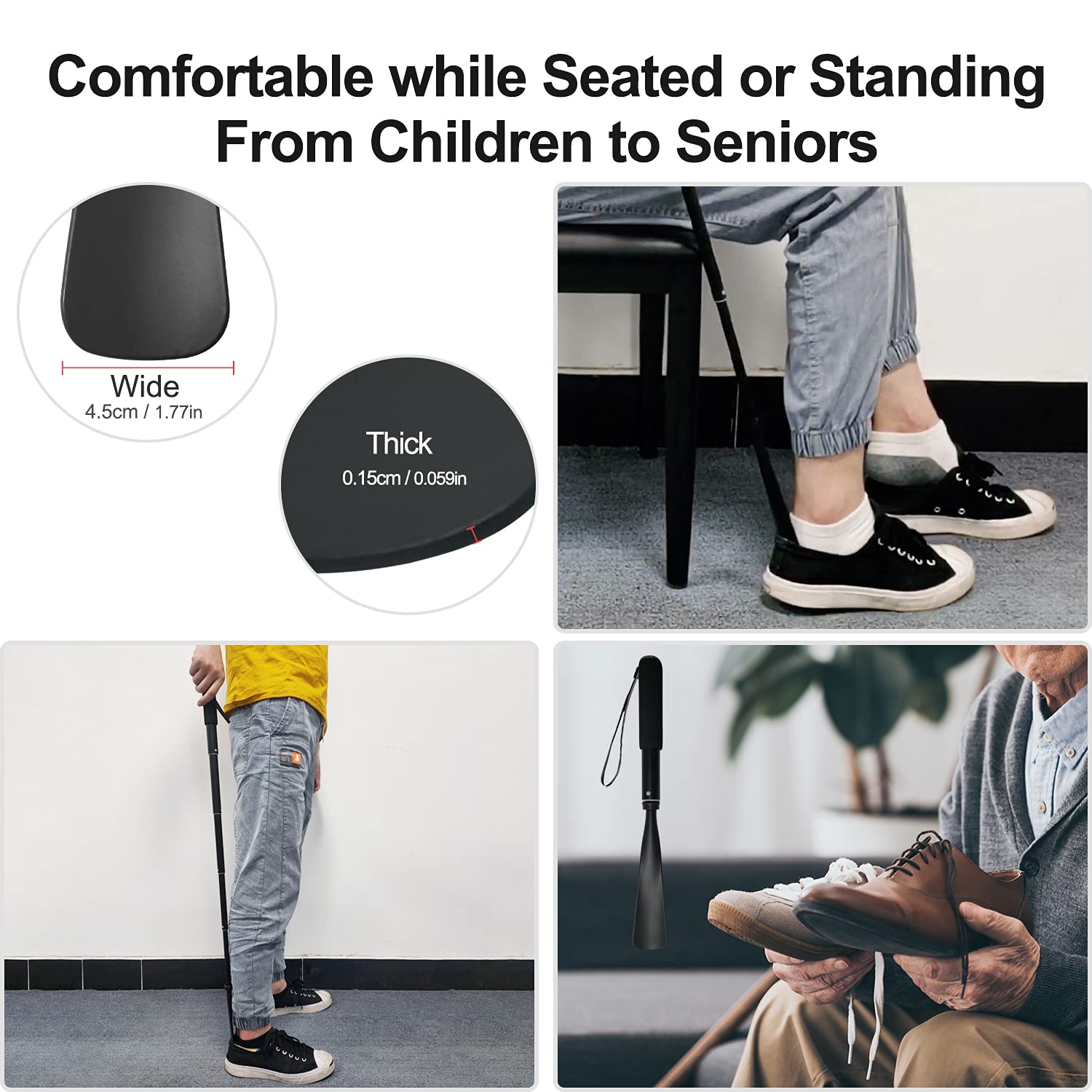 - āļø Comfortable & Highly Compatible āļø: The edge of the aluminum alloy shoehorn has a smooth, polished surface to prevent snags or tears in socks and hosiery. It is a perfect long shoehorn for seniors, or long shoe horns for men long handle, shoe horn for women or kids, pregnancy, elderly, those with limited mobility, tall people