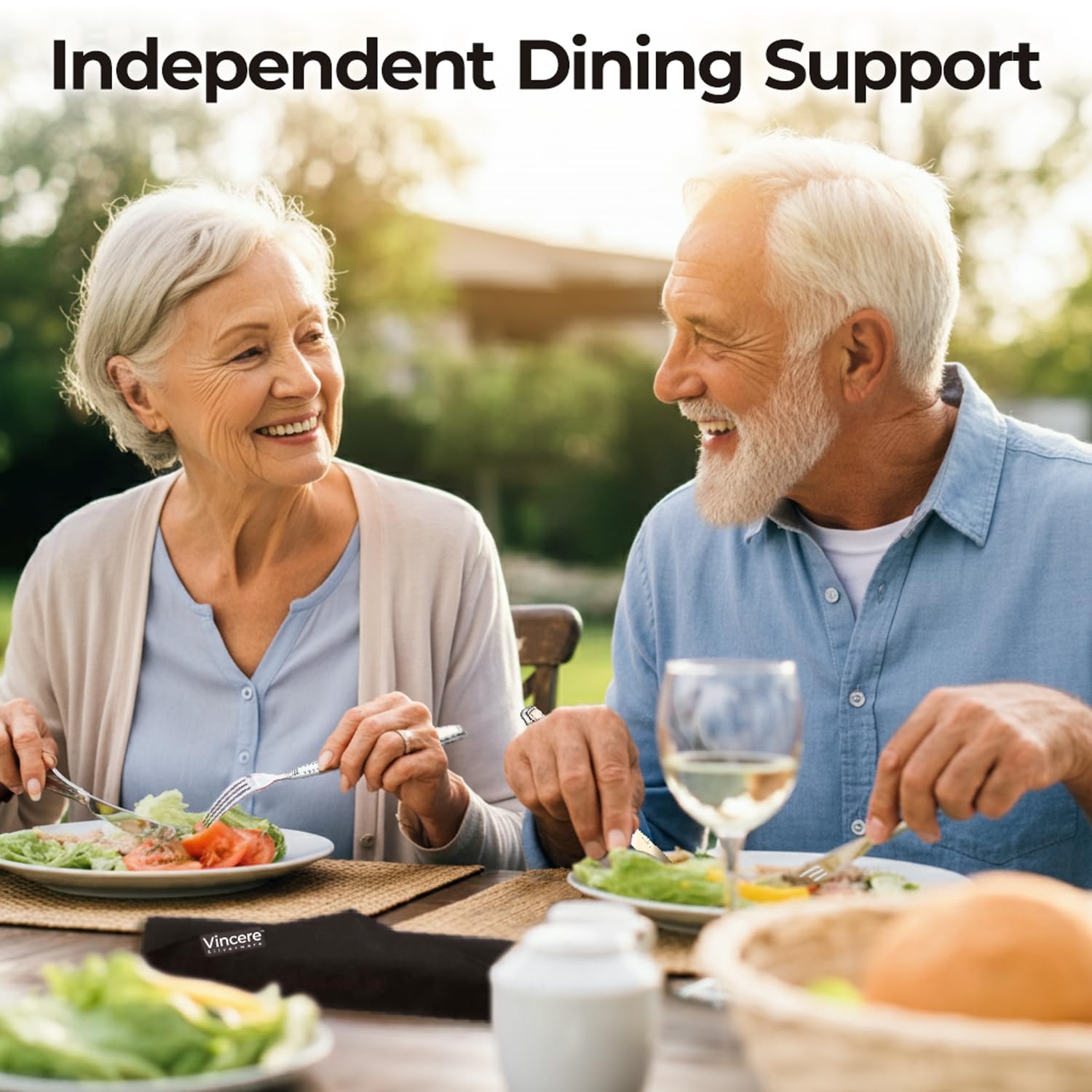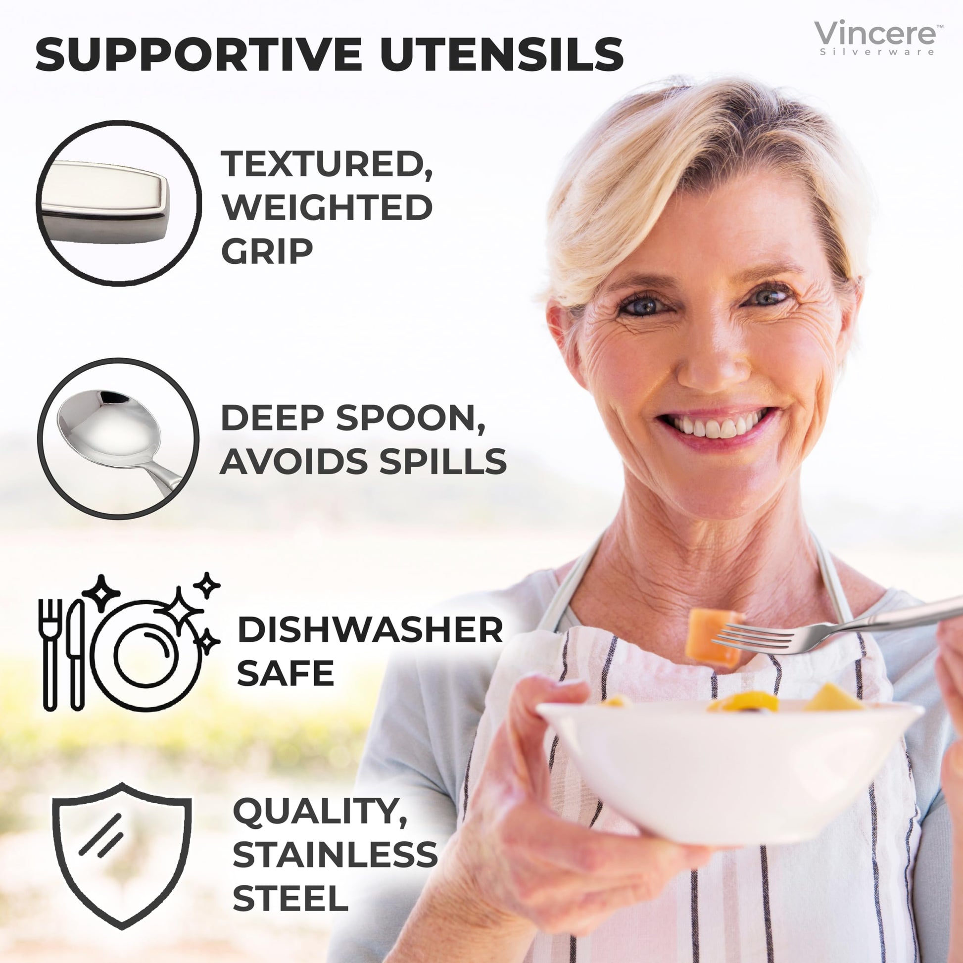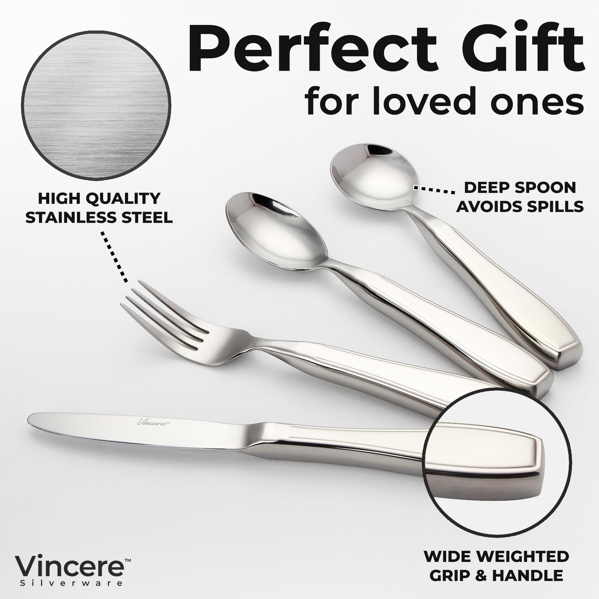 - PREMIUM HEAVY STAINLESS STEEL – Vincere Silverware weighted smart and assistive utensils are made with the highest quality stainless steel with a classic polished finish. This weights the shaky hand to give more stability and they are Dishwasher Safe for easy, convenient clean up.